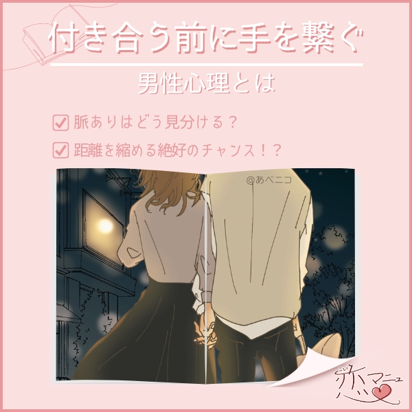 付き合う前に手を繋がれたら、前向きにとらえましょう。男性が付き合う前の女性の手を繋ぐのは、好意の表れや「もっと距離を縮めたい」という意思表示であることがほとんどです。その時酔っていたか、どのようなつなぎ方だったか、手の力の強さはどうだったかなどにも、男性心理が表れていることが多いです。